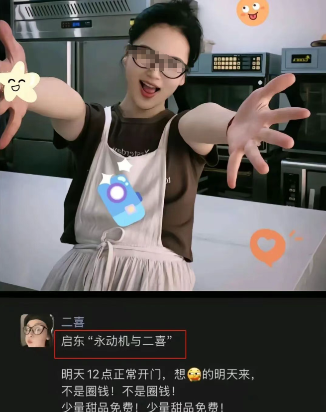 而且在她发的朋友圈里,还写到“启东永动机与二喜”,明天12点正常开门。