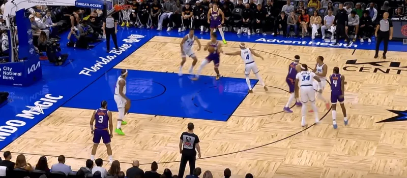 班凯罗这一次在右侧持球,太阳选择了区域防守在右侧布置,萨格斯立刻横切到左侧重新落位,班凯罗迅速甩对角助攻萨格斯命中空位关键三分: