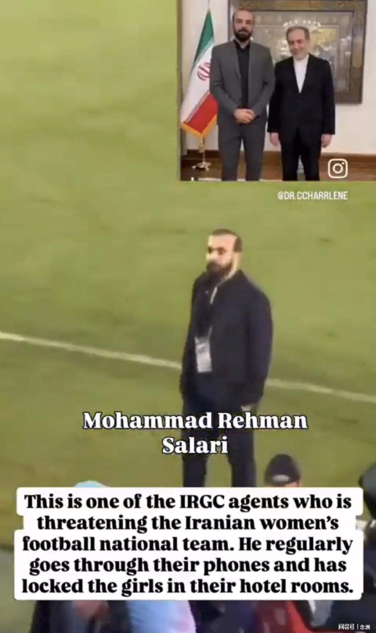 穆罕默德-拉赫曼-萨拉里被认为是伊朗伊斯兰革命卫队的特工,负责监视伊朗女足,经常查看她们的手机,并将她们所在酒店房间里。抗议者表示:“我们看到萨拉里看着我们,所以我们开始喊‘你真丢脸’。他转过身来看着我们,然后在喉咙上画了一条线,指着我们。”